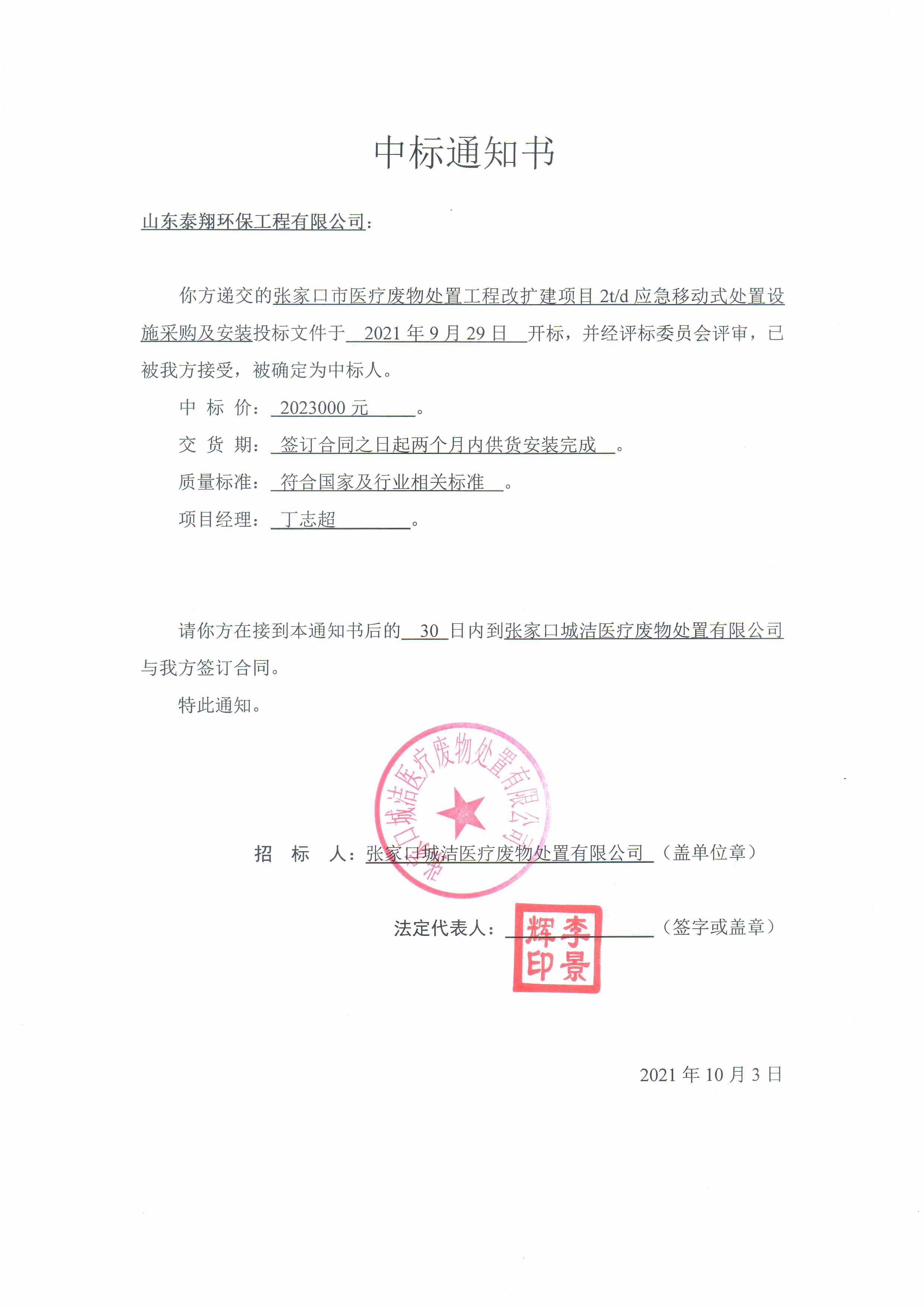 祝賀我公司遞交的張家口市醫(yī)療廢物處置工程改擴(kuò)建項(xiàng)目2t/d應(yīng)急移動式處置設(shè)施采購及安裝投標(biāo)文件中標(biāo)!